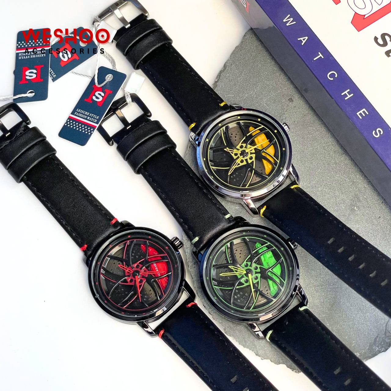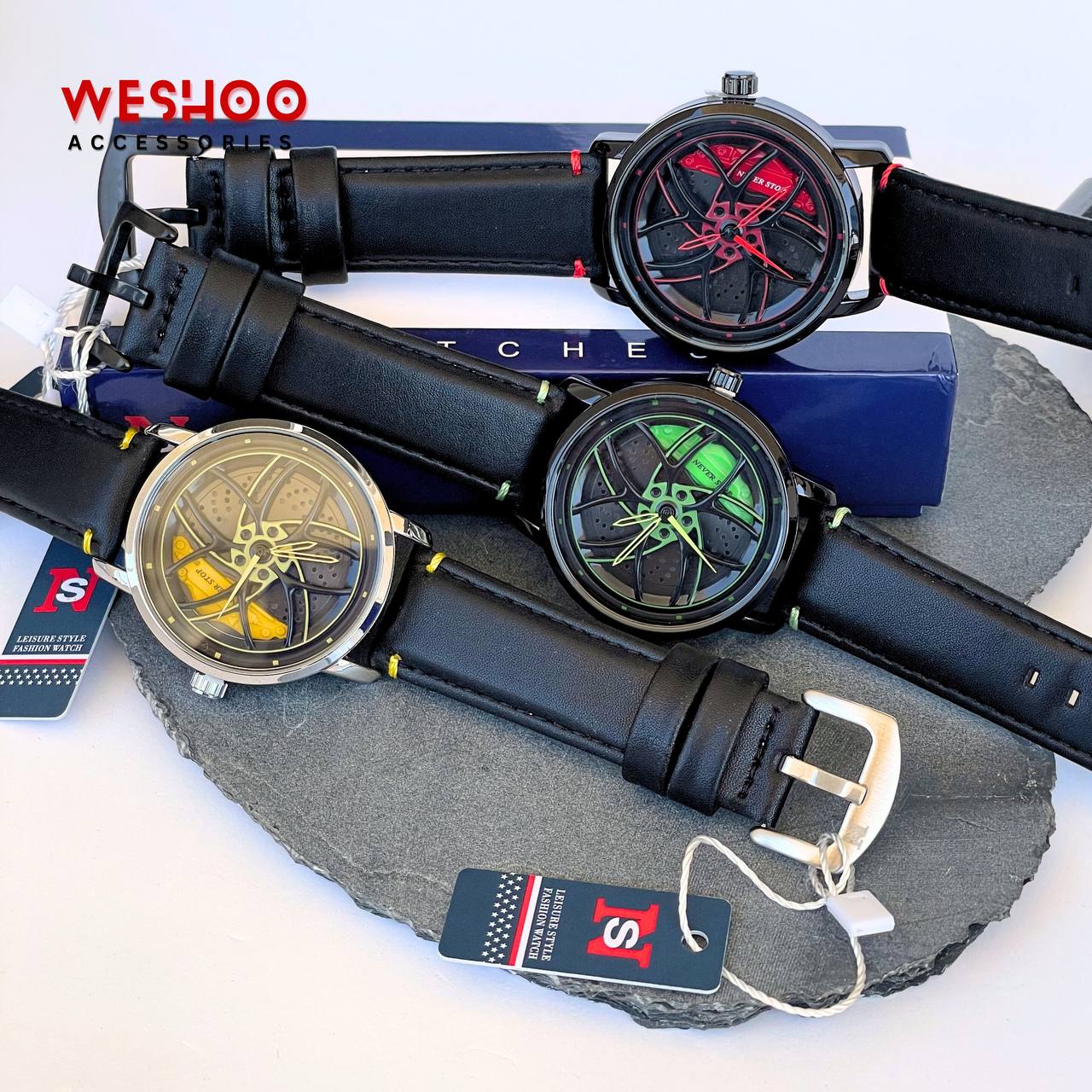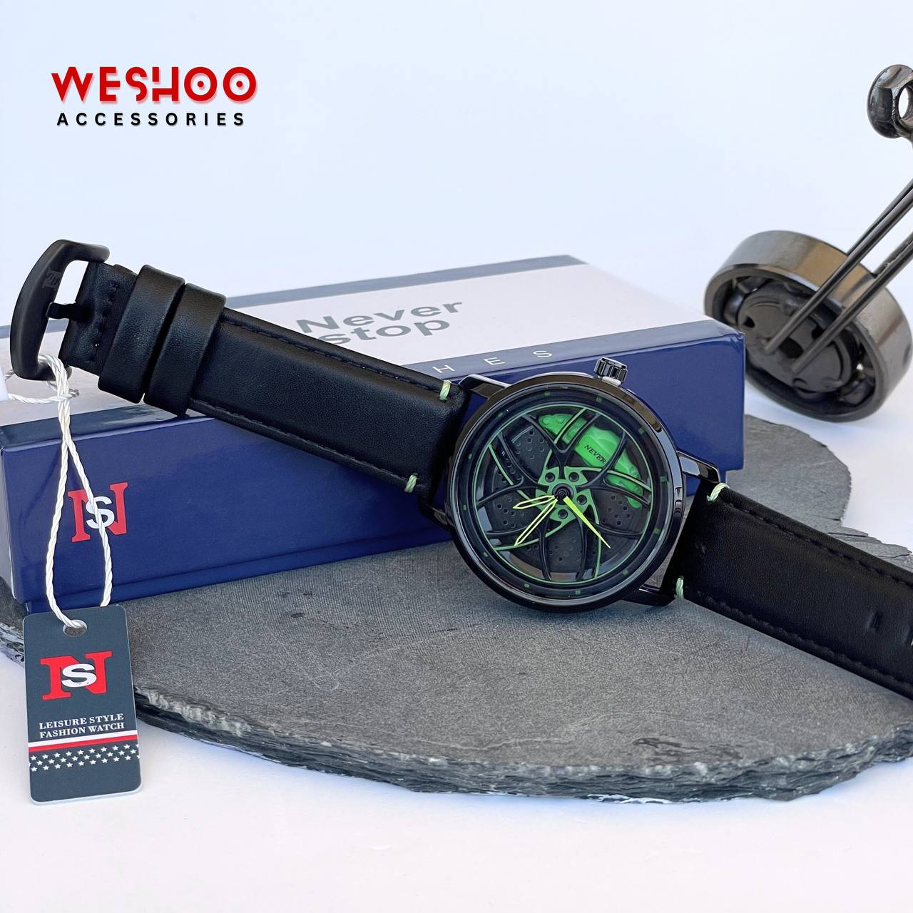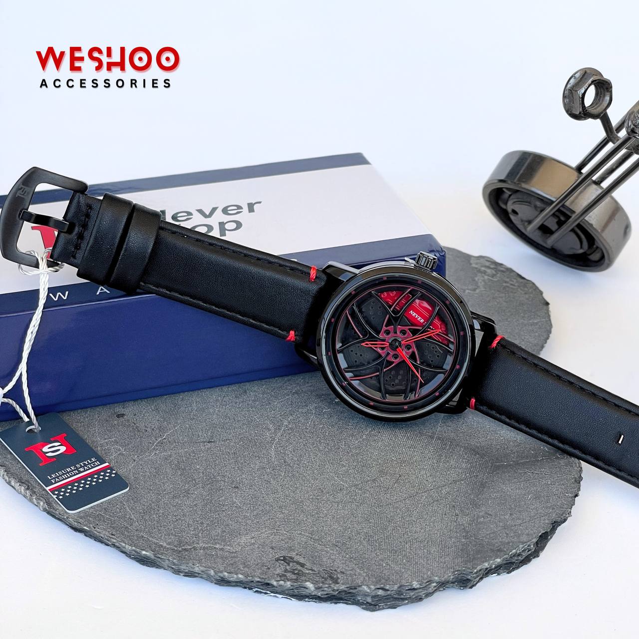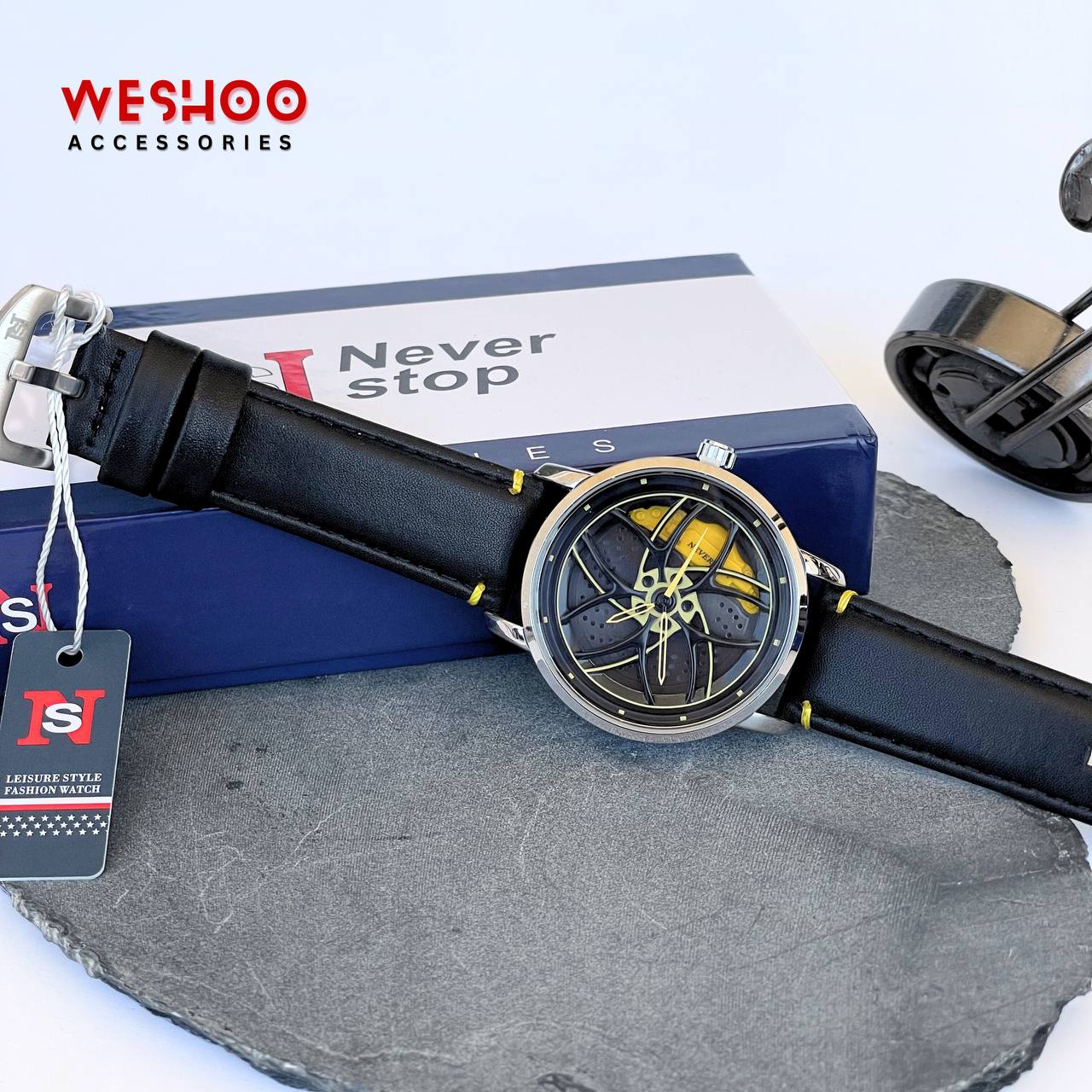 Bold. Unique. Unstoppable. The Never Stop watch stands out with its striking wheel rim dial design, now paired with a sleek, comfortable leather band. Featuring reliable quartz movement and a water-resistant build, it's made for those who live fast and never settle.