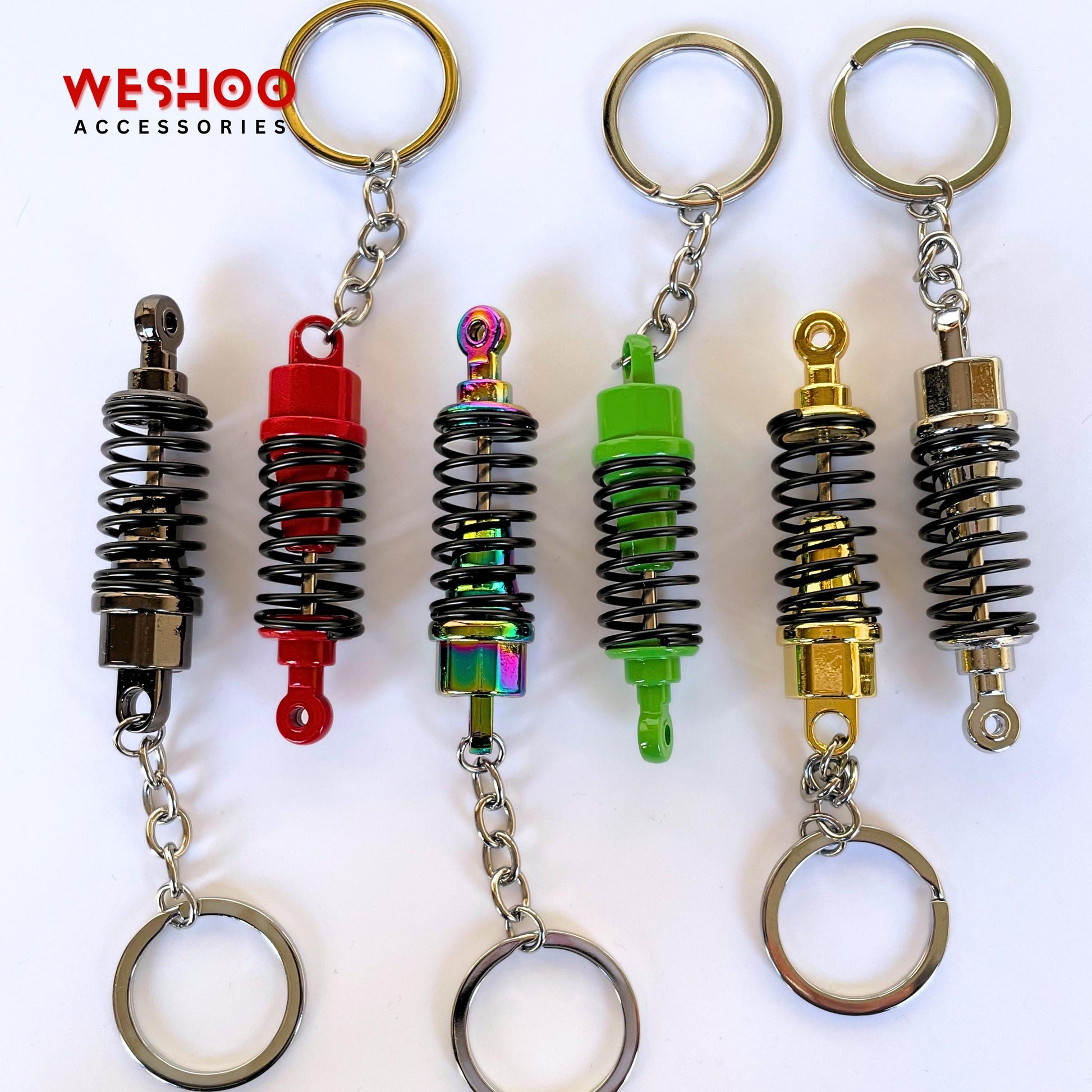 Realistic mini motorcycle shock absorber keychain with working spring. Perfect for bikers, mechanics, and motorsport lovers. Durable, compact, and full of attitude.